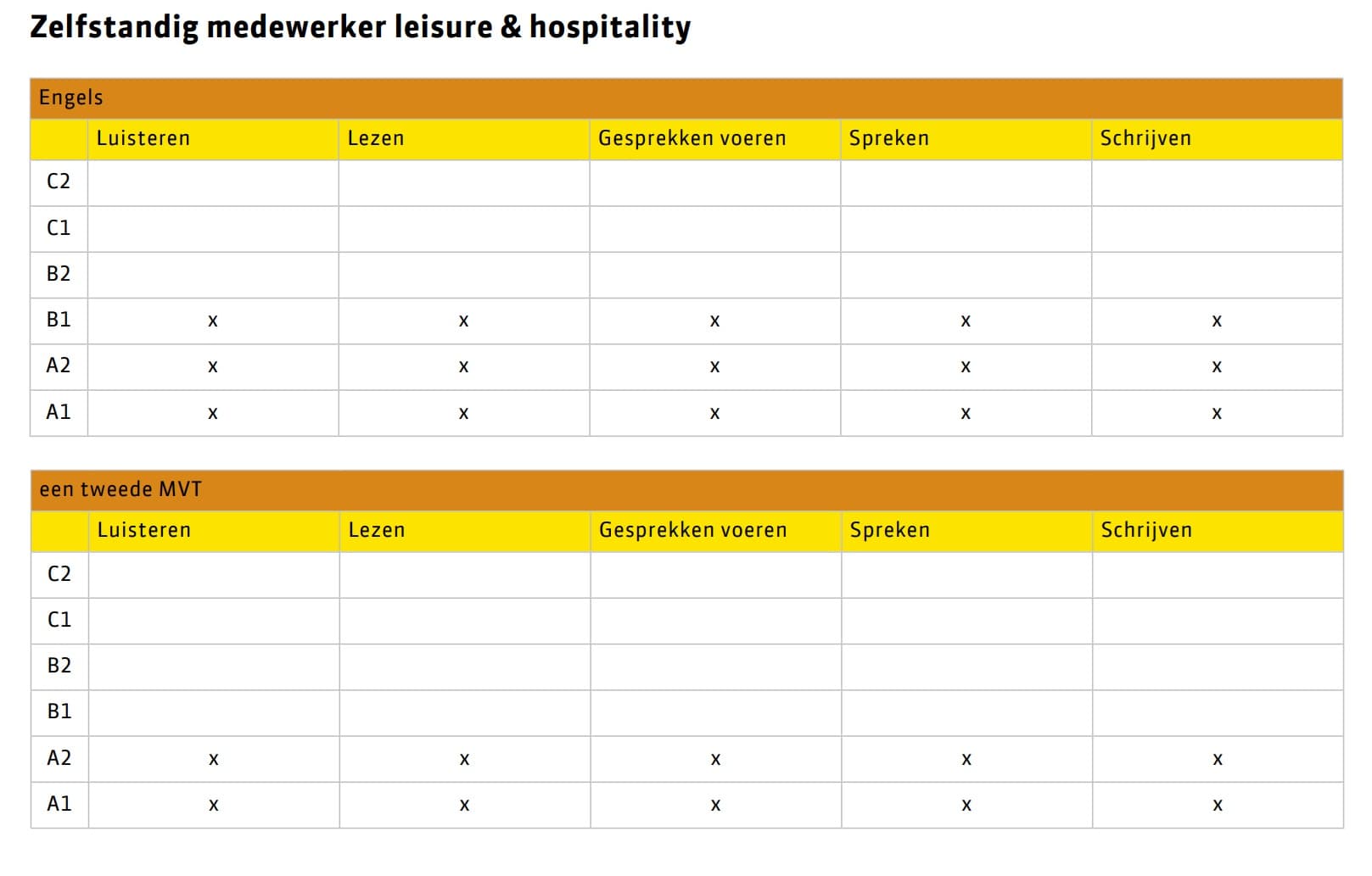 - Kan naar de klant/gast luisteren om de kern van de klantwens te begrijpen en verkoopmogelijkheden te signaleren in het Engels.
