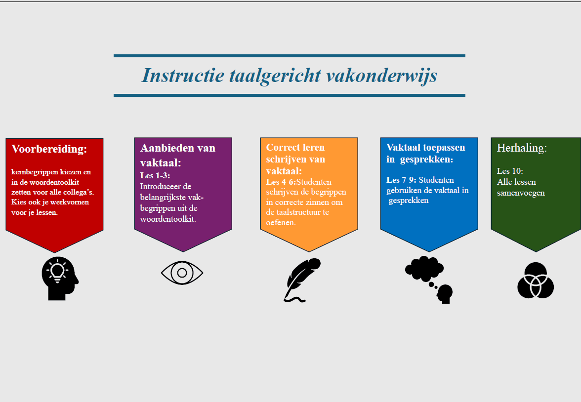 Om de taalsteun in alle lessen te versterken, ontwikkelde het team een woordenlijst met begrippen die meerdere betekenissen hebben en voor studenten verwarrend kunnen zijn. Denk aan woorden als breuk en schaal. Vervolgens wordt elke periode aan een aantal van die woorden aandacht besteed. Docenten volgen hierbij een vaste structuur met drie fasen. In de eerste weken worden de woorden geïntroduceerd, daarna oefenen studenten met het toepassen ervan, en in de laatste weken voeren zij gesprekken over de woorden om betekenis, context en gebruik te verdiepen. Door de woorden gedurende de hele periode zichtbaar te maken in het lokaal en online, worden de studenten geholpen bij het onthouden van de begrippen.